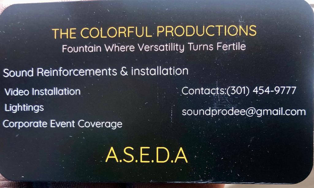 The colorful production (A.S.E.D.A) is a sound production company, we’ve been on existence since 2011 in the United States, we engage in music production, sound installation of any kind, live concerts with live recording, video recording and lightings. Our company is located in the city of Bowie, Maryland USA. All our designs are with the touch of excellence.
